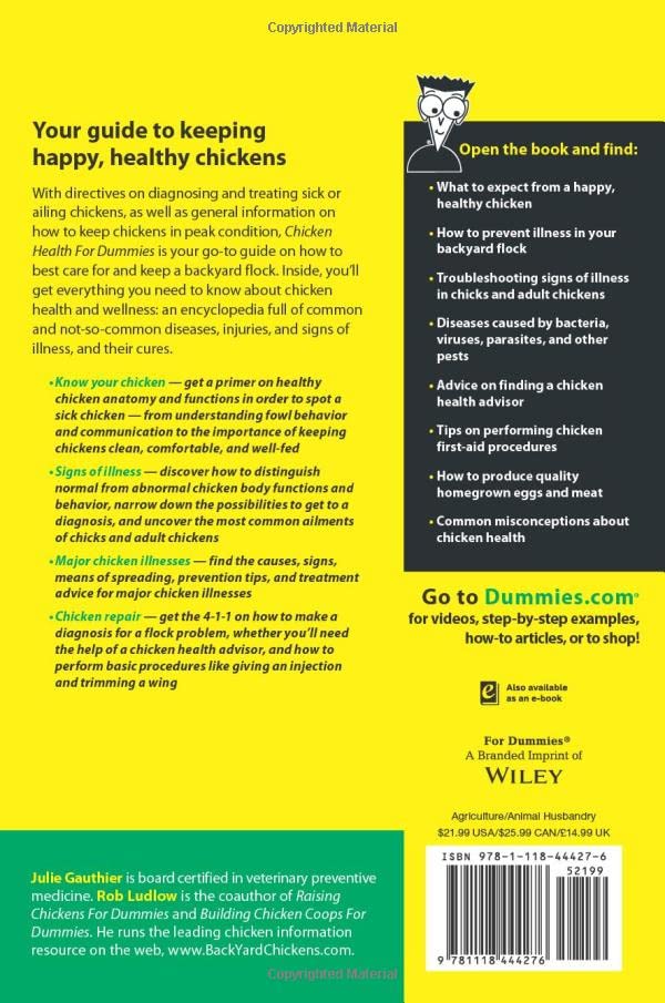 Inside, you'll get everything you need to know about chicken health and wellness: an encyclopedia full of common and not-so-common diseases, injuries, symptoms, and cures that chicken owners may encounter. Chicken Health For Dummies provides chicken owners with one handy, all-encompassing resource. Helps you identify potential hazards and signs of ill health in your chicken Shows you how to properly examine chickens to identify and isolate potential health issues before they spread to the rest of the flock An encyclopedia full of common and uncommon diseases, injuries, symptoms, and cures for chickens