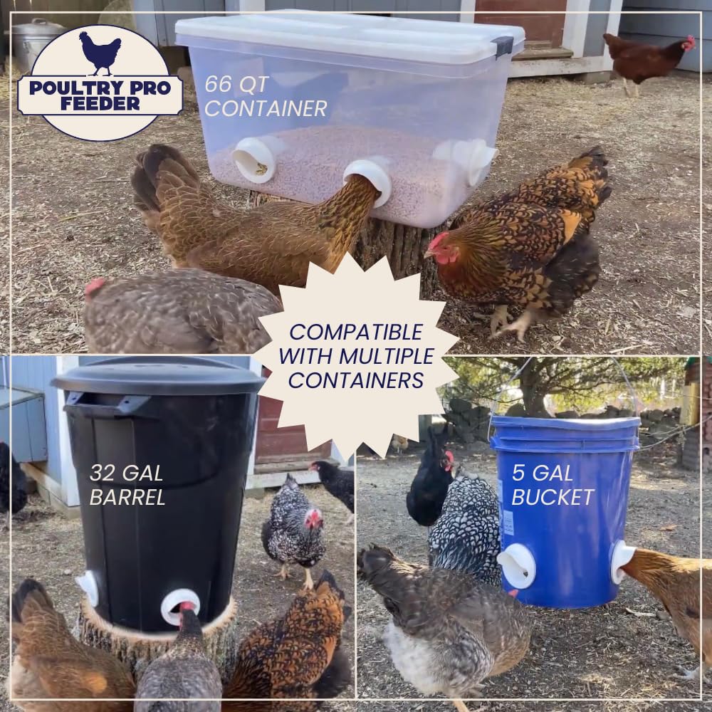 - VERSATILE: Use with ANY container. Our adaptable feeder ports can be used for buckets, bins, barrels, boxes, you name it. We make the homesteader's life easy with our truly DIY feeder kit. The larger the container, the less often you need to feed.