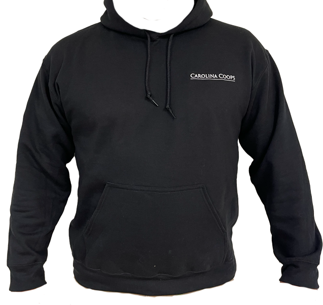 Keep warm in our mens heavy blend embroidered hooded black sweatshirt. Carolina Coops embroidered on front chest and the back says "Carolina Coops - Custom Designed Chicken Coops"