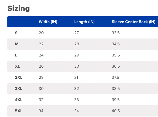 Gildan brand - see size chart