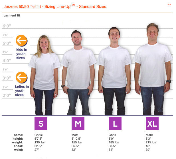 These custom Jerzees t‑shirts are half cotton and half polyester. The cotton makes them thick but breathable, while the polyester makes them hydrophobic and highly resistant. "Hydrophobic" means they wick moisture. When we say they're "highly resistant," we mean resistant to both wrinkling and shrinking, two of our main woes with laundry.