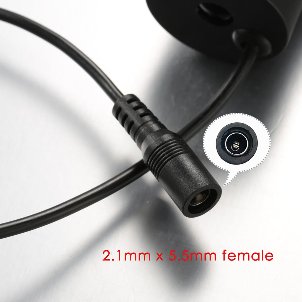 • 1/2" Male thread on the pump. The OD of the brass coupler is 10mm. Plug type: 2.1mm x 5.5mm female. NO POWER ADAPTER INCLUDED