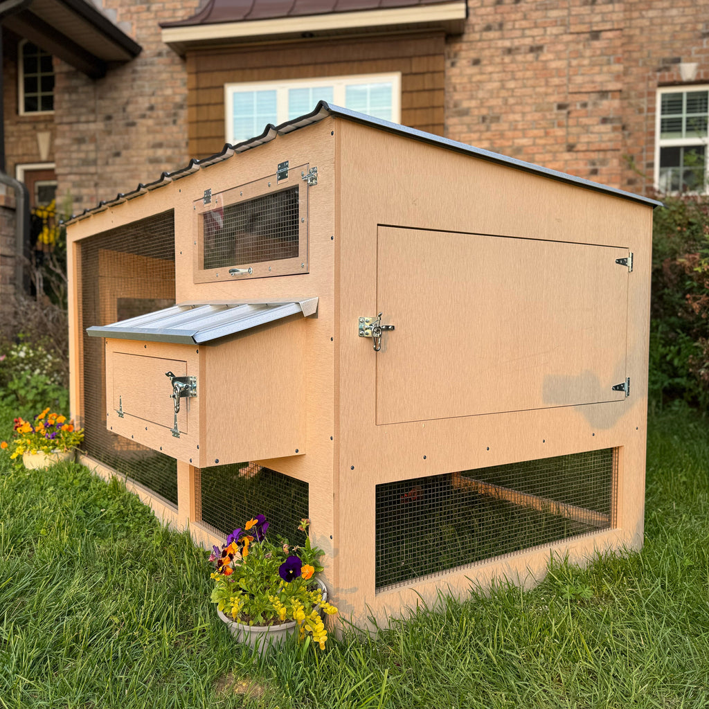 The Eco Coop is constructed from ACRE™, an extremely durable, water-resistant building material that is made entirely from up-cycled rice hulls. This is the same material with which we line all of our deep litter beds, and it performs beautifully in all climates and conditions. Just like wood, ACRE™ can be painted or stained to match your aesthetic.
