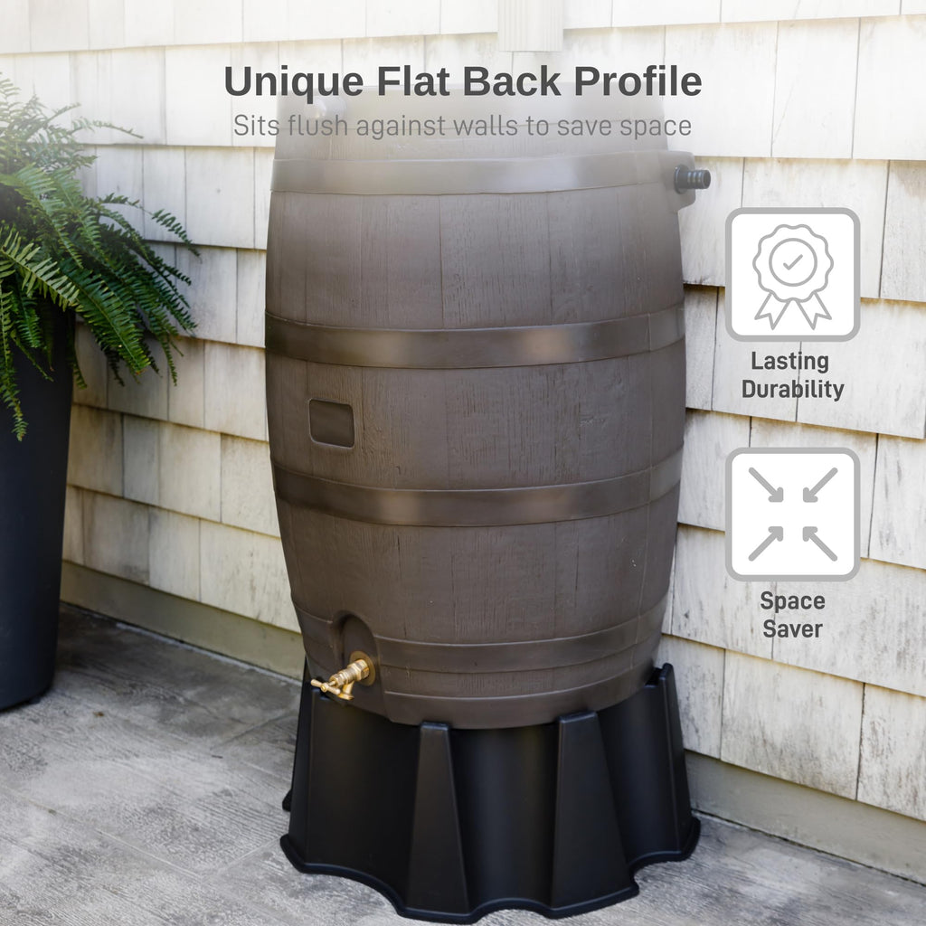 - Sleek, Textured Design: Blends seamlessly with outdoor décor for an attractive and functional addition to your yard. Flat back shape allows the barrel to fit snugly against walls or fences, perfect for tight spaces. Optional rain barrel stand sold separately.